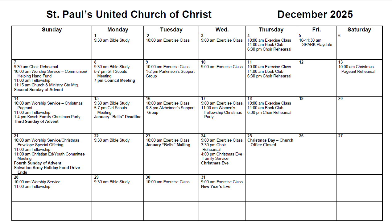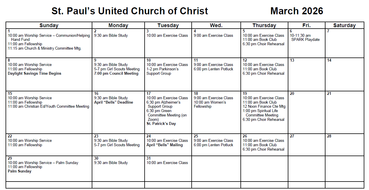 Check out our monthly calendar to keep yourself informed and organized, so you don’t miss all the activities, meetings, and events happening at St. Paul’s United Church of Christ.